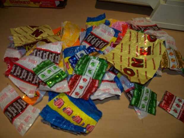 Para las envolturas pueden ser cualquier tipo de envoltorios, por ejemplo: envoltorios de golosinas, envolturas de chocolate o ráfagas de estrellas. Elegí envoltorios de golosinas porque tenía más y tienen más color para ellos.
