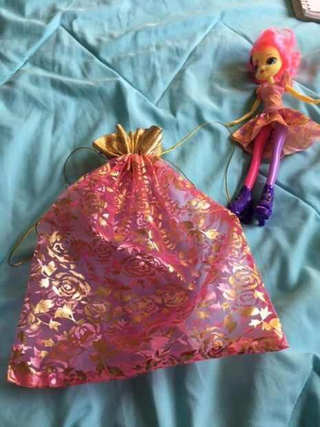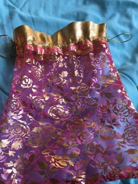 Encontré un saquito con una banda de oro y red rosa con flor dorada impresa. Pensé que sería usar esto para hacer el vestido. De esa manera también llego a reciclar y reutilizar en vez de comprar nuevo material.