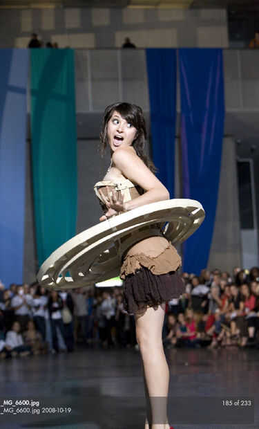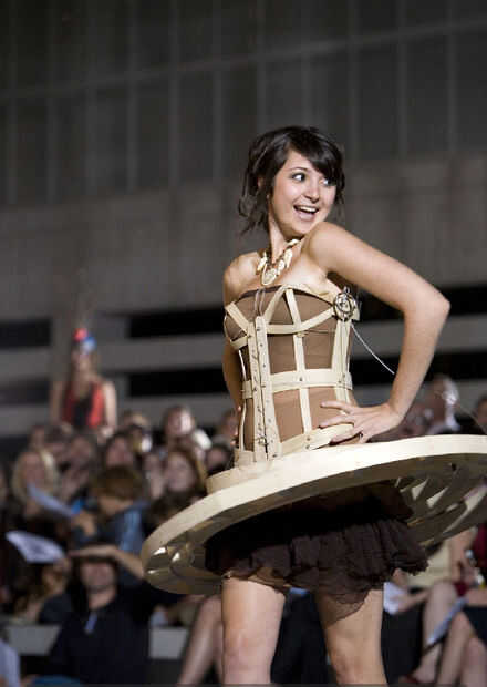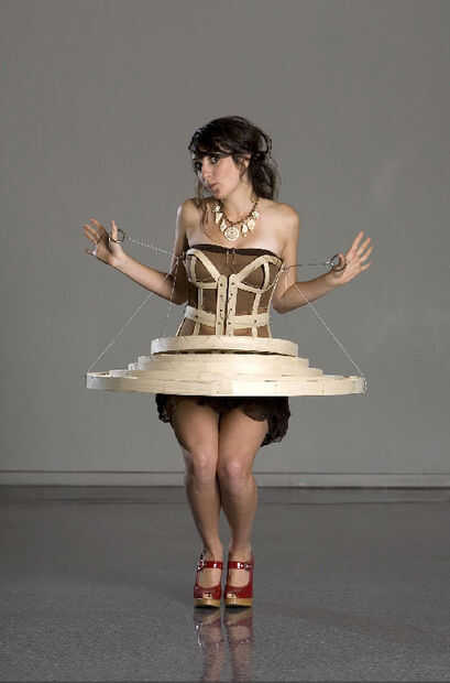 La falda es totalmente mecánica, simplemente tirando de los aros en ambos lados del pecho de la modelo la falda entera levanta y cae dentro de sí mismo a "inclinarse".
