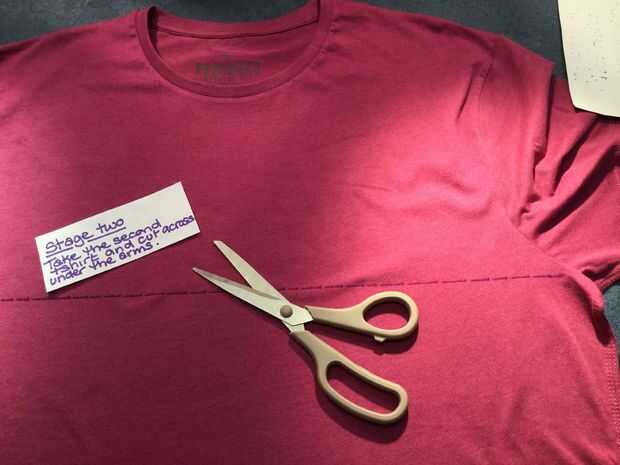 Para crear la parte inferior la mitad del vestido: tomar la próxima camiseta y cortar la parte inferior debajo de las axilas.