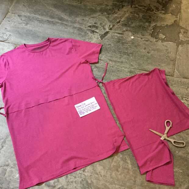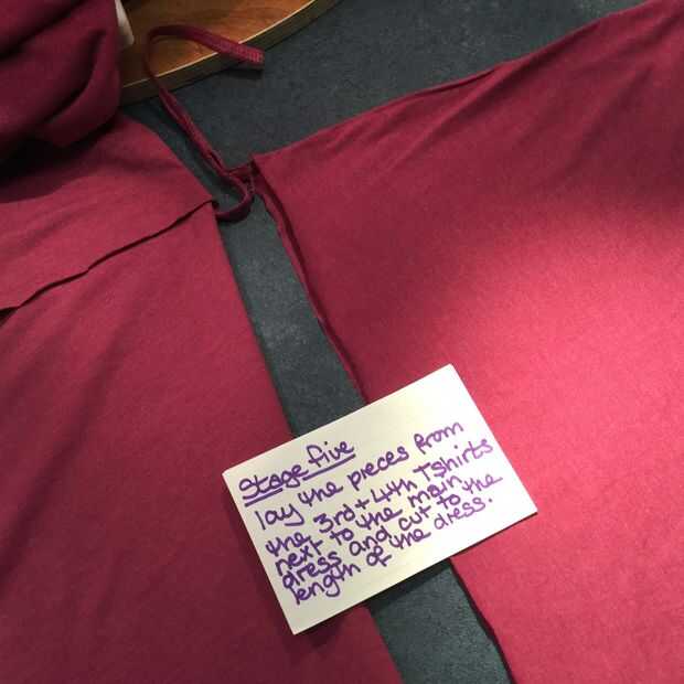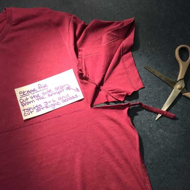 Camisetas tres y cuatro se cortan de la misma manera: cortar la costura de la axila y luego corte recto a través de la camiseta. Coloque la pieza que tiene corte (largo corte costura en la parte superior.) paralelo a la fractura lateral del vestido. Recorte la parte inferior del rectángulo con la longitud del vestido.