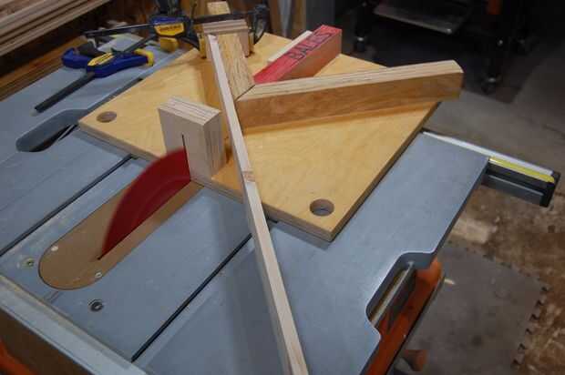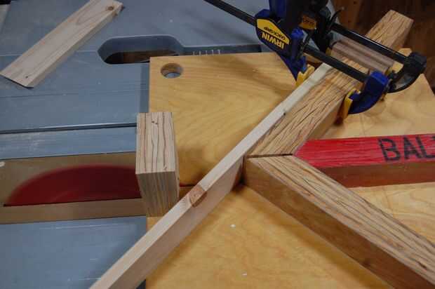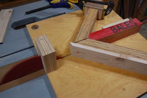 Usé una tienda construida trineo de inglete para cortar mis ingletes (obviamente). Están construidos para que corte un lado o la articulación a cada lado del trineo asegurando una esquina de 90 grados perfecto. Hago mi primer corte a la izquierda y la dimensión final corta a la derecha... por lo que la derecha tiene un bloque de tope. Configurar este bloque de tope para una longitud de 9 1/8"