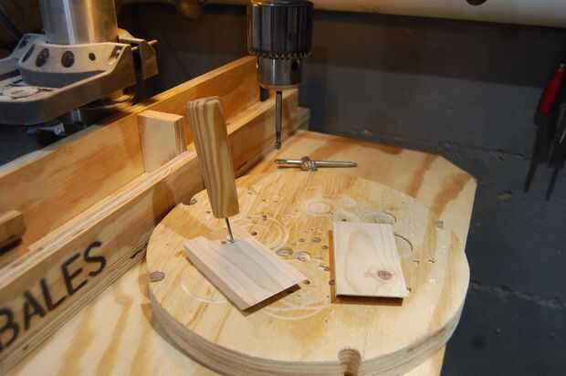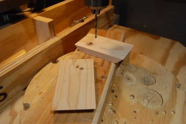Con la colocación del marcado, empecé los orificios con un punzón y entonces perforado 1/4" de profundidad con una broca de 1/4" forstner. Luego cambiar la broca de 9/16" y había terminado la perforación a través de la parte. Esto permitirá introducir la varilla y luego enchufe el agujero con un trozo de 1/4" espiga. Otra opción sería la de sólo utilizar un poco lo suficientemente grande para la barra de acero, deje la varilla larga y lijar al ras de la caja.