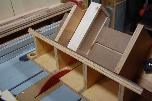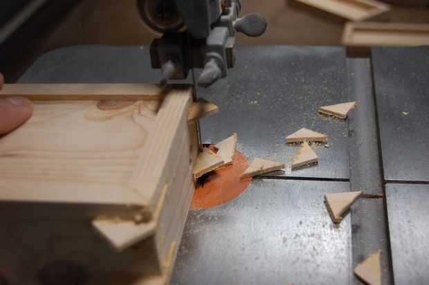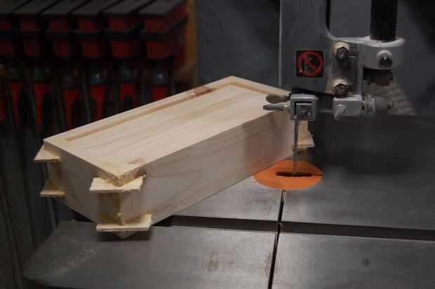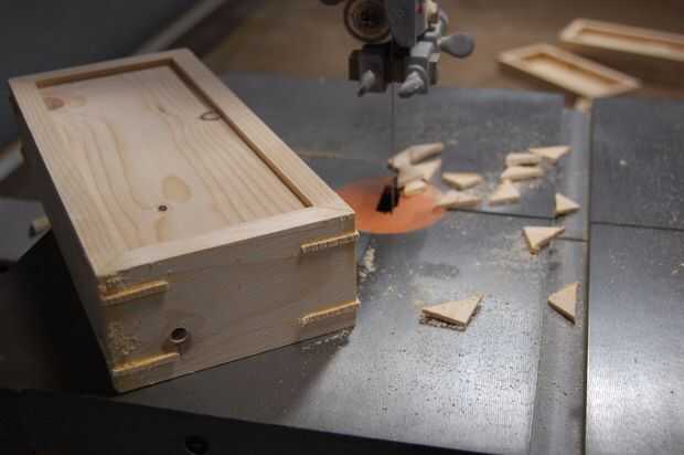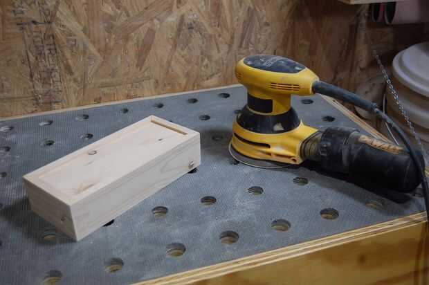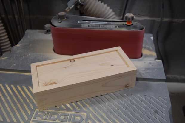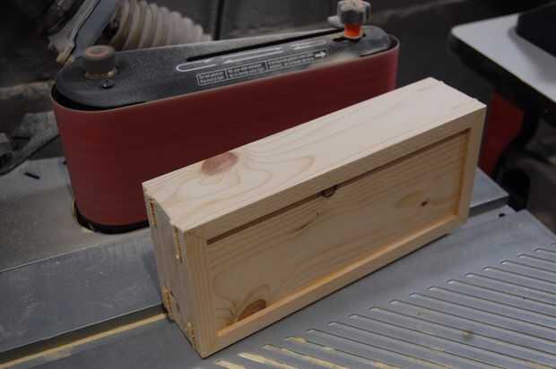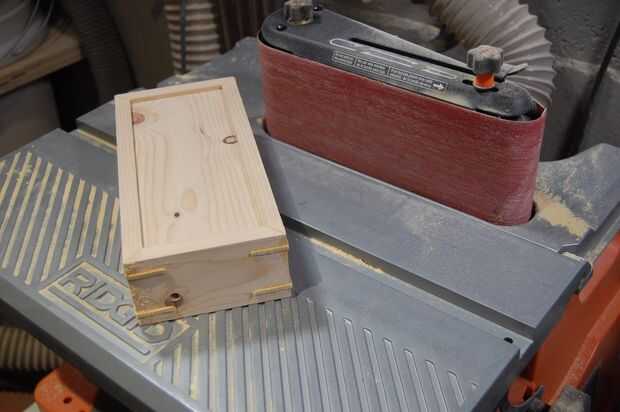He utilizado la lijadora de banda oscilante de la descarga hacia arriba de las ranuras, pero una vez que los tiene todo cerca, cambié la lijadora orbital para terminar el trabajo. La lijadora de banda es agresiva y realmente puede alterar la forma de su caja rápidamente.