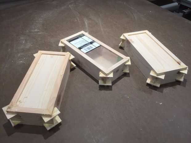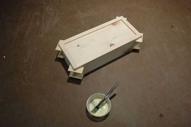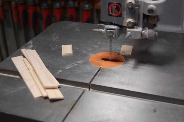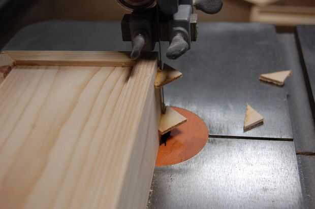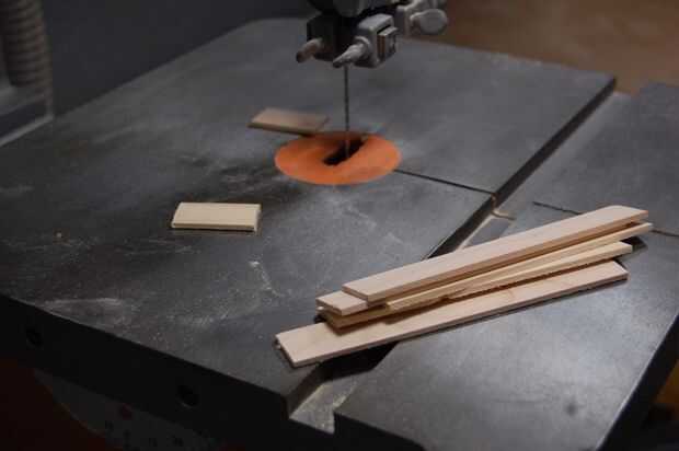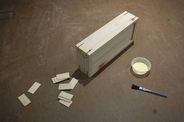 De la acción que muele hasta mi corte de lámina, copio 3/4 tiras con la Sierra de mesa. Entonces yo cortar en 1 3/4" largo secciones usando la sierra. Me Unte pegamento en cada ranura con un pincel ácido (fuente de la plomería) e inserta en cada muesca de la esquina.