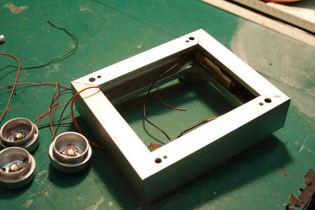 Perfore agujeros en los extremos de los rieles superior e inferior del marco, donde las tuercas de barril Conecte el LED. Tenga en cuenta que las baterías van a se encuentran en los rieles laterales. Este agujero debe ir limpio a través de toda la trama para crear un agujero de acceso de destornillador en la parte posterior del marco. Esto permitirá colocar el LED mucho más fácil.