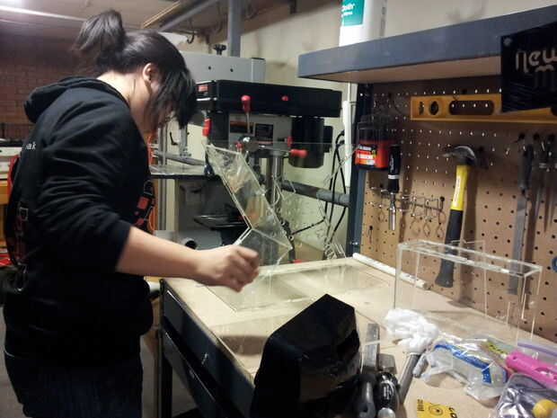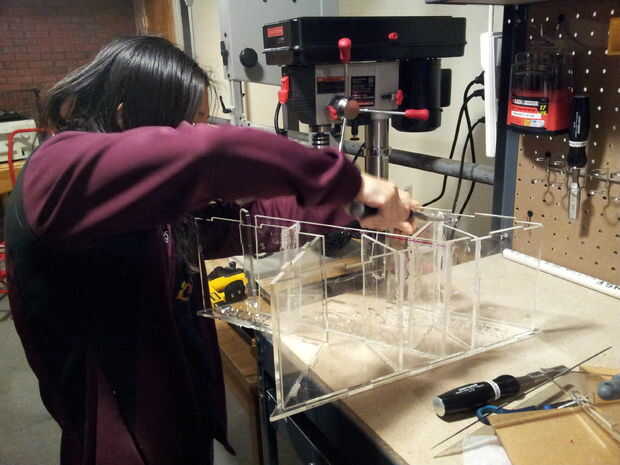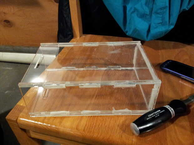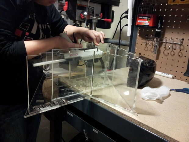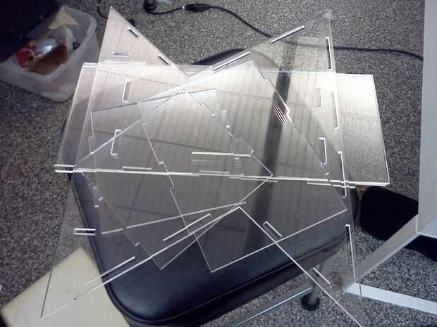 Después de cortar todas las piezas de la carcasa, es tiempo para la Asamblea. Deben juntar las piezas según el diseño especificado en el modelo CAD. Después de confirmar que todas las piezas encajan donde se supone que, utilice una pistola de pegamento caliente para unir todas las articulaciones. Utilice el cincel y papel de lija para pulir las esquinas y bordes.