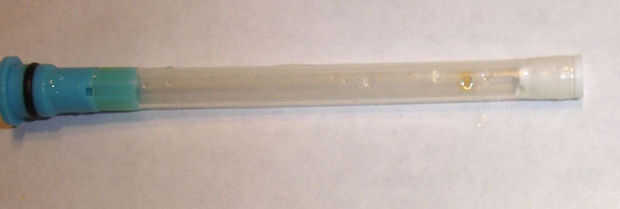Se puede obtener las uñas debajo de los bordes del tope azul y extraiga el conjunto del tubo. En el otro extremo del tubo de tapón azul es un tapón blanco. Retire y enjuague todo bien.