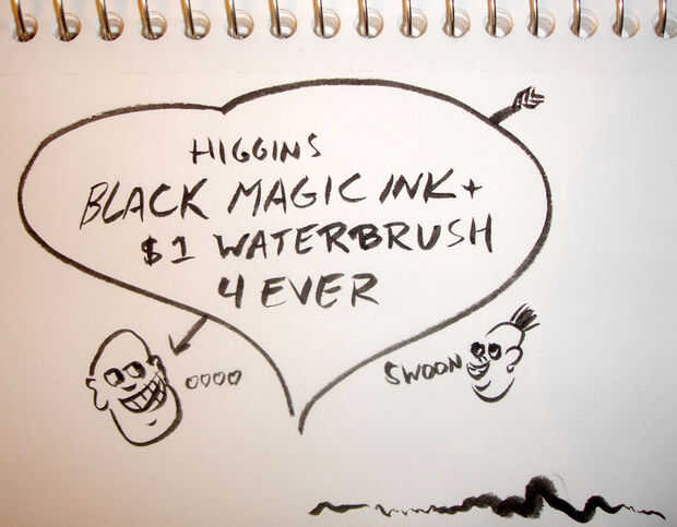 Gracias a SeamusDubh por la idea de recordatorio: usted puede utilizar tinta en lugar de agua cuando se rellena hacia arriba! He usado tinta Higgins la magia negra, que viene con un tapón cuentagotas. El flujo es un poco seco, pero un apretón suave wettens el derecho de línea para arriba.