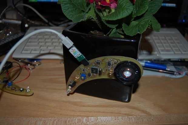 Instale las baterías en el portapilas. Nada debe suceder aún. Conecte la interfaz de programación de "Enchufe de apoyo" a su ordenador con un cable USB y enchufe en el puerto de programación en el Whisperer de la planta. Ahora, conecte el puente de programación - fuerzas el circuito permanezca encendida todo el tiempo, en lugar de esperar una señal "on" desde el temporizador IC.