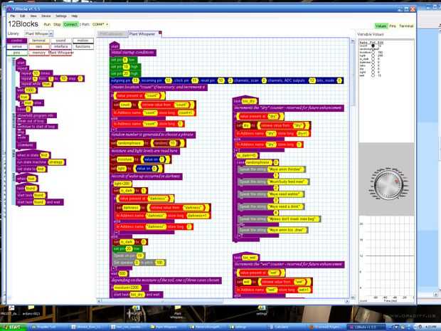 Cargar el archivo Whisperer.12b de la planta en 12blocks y subirlo. Sólo debe tomar unos segundos. Una vez hecho esto, el hombre que susurraba a planta debe venir a la vida! Si parece estar funcionando bien, cargar el programa permanentemente en memoria EEPROM seleccionando "Cargar permanentemente".