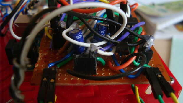 El pin 8 de ambos conductor del motor ICs también está conectado al pin de Vin ya que suministran energía a los motores. Dos condensadores electrolíticos de 100uF están conectados al pin 8 de ambos los conductores del motor. (Los condensadores electrolíticos están polarizados... Asegúrese de que el + ve terminal está conectado al pin 8 y el - ve de terminal a tierra!!!!!!)