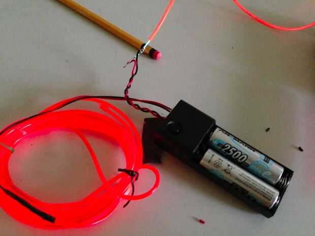 Prueba el cable! Utilizar una batería de 3 voltios EL inversor con dos salidas de potencia. Siempre pruebo mi nuevo cable con un cable ya conectado y encendido. Si hace el otro cable salir (y no enciende para arriba sí mismo), entonces debes haber cortocircuitos lo. Si el otro cable se mantiene brillante, pero su nuevo cable no se encienda, entonces tienes una conexión, o ambos, no funciona. En cualquier caso, cortar el área defectuosa y comenzar de nuevo. Por darse a sí mismo 12 cm de alambre extra para trabajar con, tienes espacio para errores en.