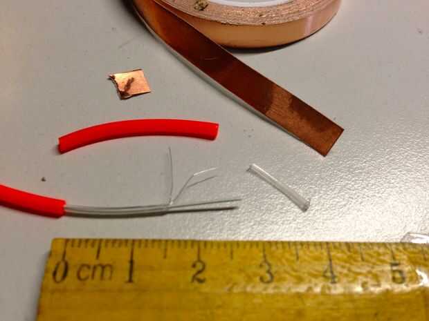 Con pelacable, tomar de 3 cm de la vaina externa de color. Esto debe exponer una envoltura plástica transparente interna. Ahora, usar una parte más pequeña del diámetro de tus strippers para despegar cuidadosamente de 1,5 cm de la envoltura de plástico transparente. Esto debe exponer los dos hilos de cabello de Ángel por debajo. Si se rompe uno, eso es aceptable. Les tuerza. Enrollar y pegar un cuadrado pequeño de cinta de cobre (5 mm x 5 mm) por debajo de 5 mm donde se quitó la envoltura de plástico transparente. Envuelva los pelos del ángulo sobre la cinta de cobre.