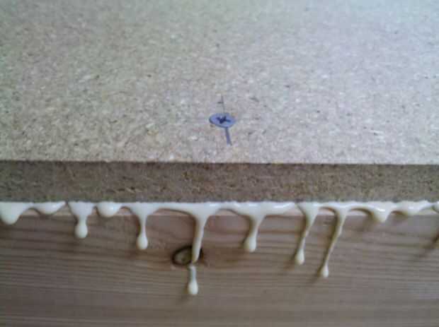 Mientras que el peso de la tapa de tabla proporciona un montón de fuerza de sujeción, decidí ejecutar un tornillo para madera en aproximadamente cada dos pies como lo hicimos con el saliente. Limpie el pegamento que se puede llegar con una toalla húmeda.