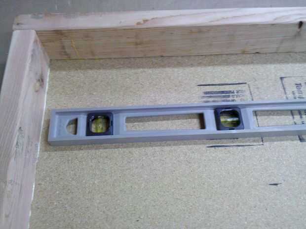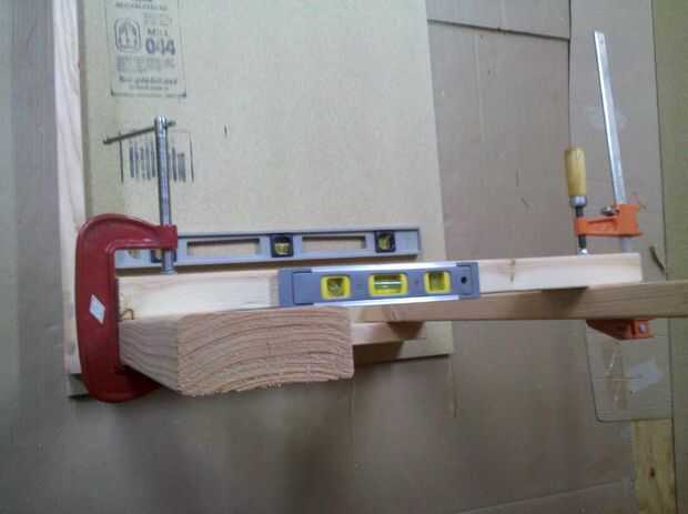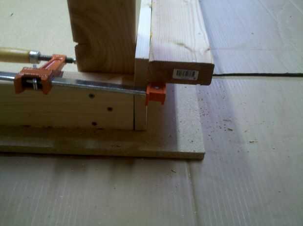 A continuación, fije los restantes soportes laterales entre la parte delantera y patas traseras. Determinarán estos soportes donde se ubicará la plataforma. Coloqué sobre un pie de la parte inferior (arriba, en el momento) de las piernas. Marcar la distancia en ambas piernas, el apoyo a una pierna de la abrazadera y utilice un nivel para mover el otro extremo como necesario para que el nivel de soporte. Usé sólo tornillos para asegurar estas llaves y no se pegue. Es mejor hacer las dos cosas, pero es difícil hacer la nivelación por sí mismo rápidamente así que me salté el pegamento.