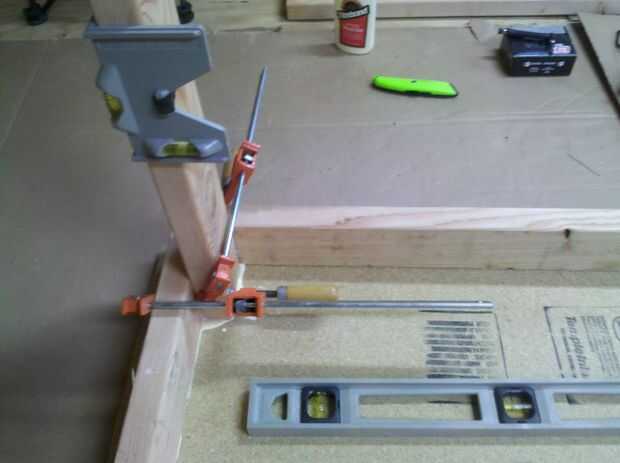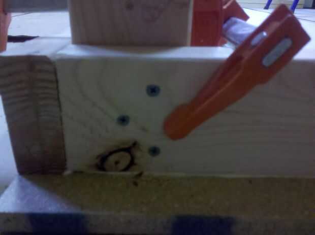 Para las patas delanteras, sólo tiene un 2 "x 4" para conectar las patas en este momento. Desea la pierna al ras con el frente de la otra llave porque cual sujetando el reborde de la herramienta a cada una de ellas. Pegamento, nivel y abrazadera la pierna similar a lo hicimos en las patas traseras. Volver a utilizar un patrón de triángulo para los tornillos.