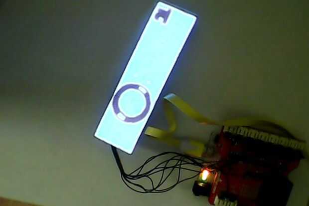 El objetivo era crear una reloj/pulsera de estilo tron (hizo su propia exhibición en una hoja de electroluminesence llano, que me he olvidado de escribir primero:-). En este primer intento los contactos entre el alambre y electrodo no funciona confiable (especialmente con removign solo el aislante para una pequeña parte y oprimir esta parte de la superficie (el aislamiento levantarlo otra vez). El resto - peeling del electrodo de la parte trasera y la pintura una nueva tinta conductora funciona bien, y la conexión con los cojines más grandes funcionaron bien. Arduino en la parte inferior del escudo EL Escudo solo cambia cada pin de salida después de unos a otros. El inversor se suelda en el área de prototipo en el escudo, conectado con 5V y Gnd en la baja tensión - lado CC y con la salida del inversor pernos de alta tensión - lado CA. Electrodo superior está conectado con la tierra común y las partes exteriores del electrodo posterior con la otra clavija de la tensión (siempre encendida, para evitar una quemadura por el inversor). Partes cambiables del electrodo posterior están conectadas con diferentes elementos de semiconductor, controlada por arduino (el pin cerca de la letra impresa de cada puerto del escudo).