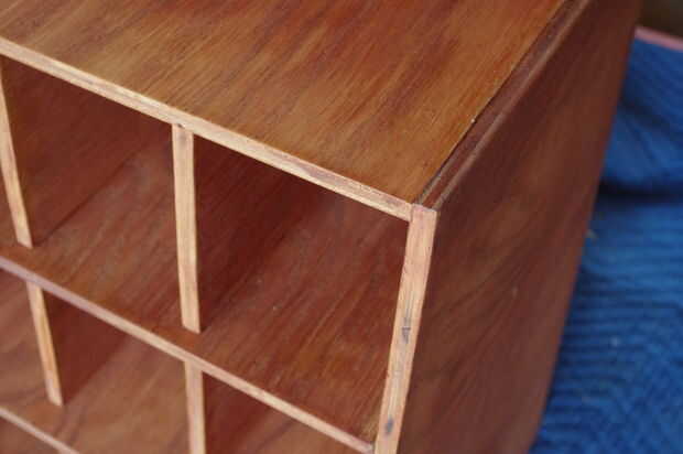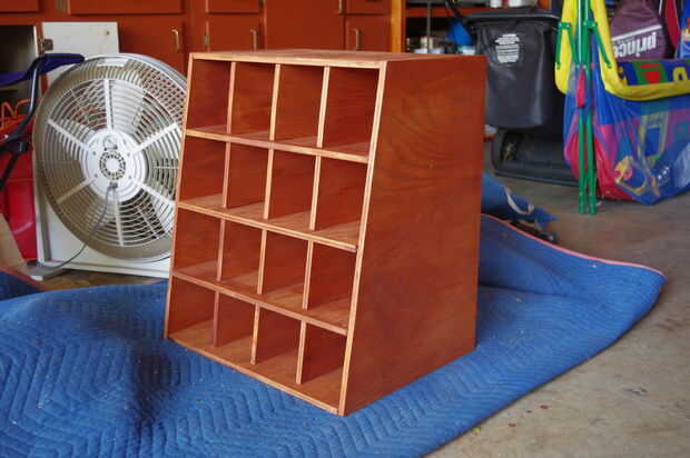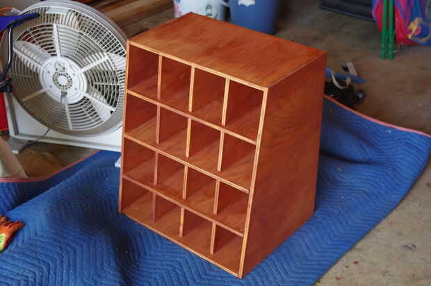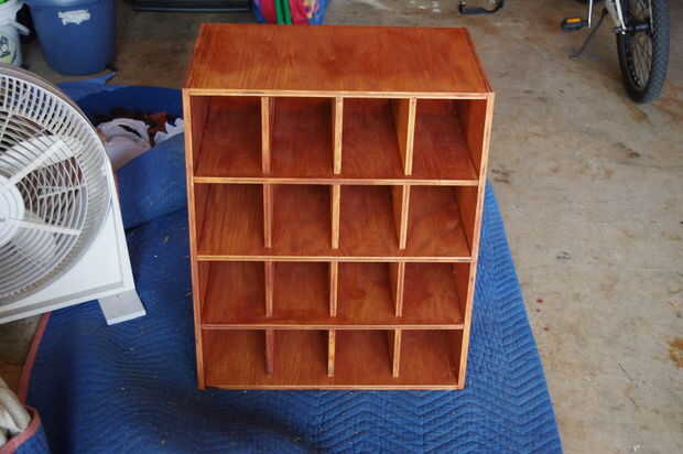 Aquí se tiñe con una capa de impermeabilización. Los lados se llevan a cabo junto con las placas de galletas. La matriz del cubo interno solo se ha deslizado dentro. Me sorprendió que ajusta perfectamente. Ahora este es lo suficientemente fuerte como para zapatos y un par de cosas en la parte superior, tal vez 30 libras a más... pero nadie va a usar esto como un banquito... Cubrió con un aerosol del poliuretano claro después de que mi esposa se hizo la pintura de los lados.