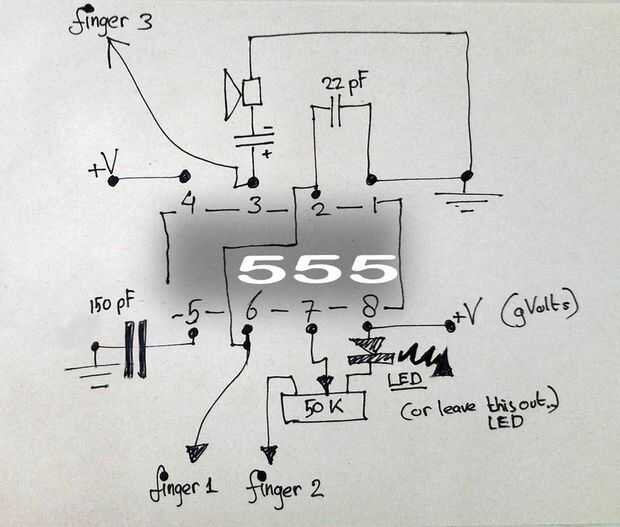 Los condensadores adicionales y algunos alambres que pueden ser tocados por el dedo ((puedes hacerlo en casi todos los pines de los 555) hizo más diferencias de sonido aparecen, yo podría hacer un "beso" sonido y otros extraños paisajes sonoros.