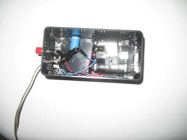 poner el cable del altavoz a través de su orificio de 1/4" y su interruptor throug el orificio de 3/8" y luego apriete la tuerca en el conmutador. luego pegue el condensador en el interior de la caja del proyecto y colocar sus baterías dentro. después de este puesto el plástico de la tapa encima de tu caja de proyecto poner un cinturón entre las tapas de plástico y de metal y apriete sus tornillos.