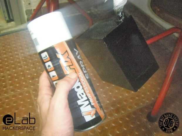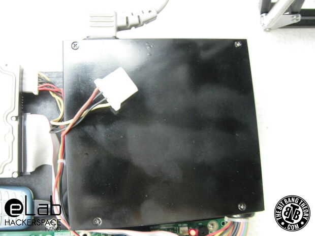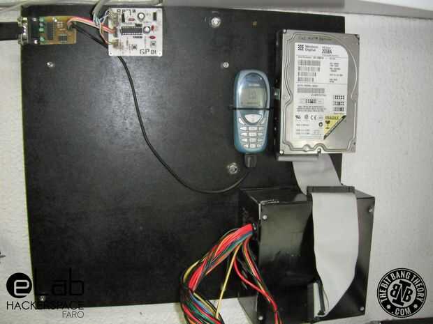 Con el fin de mantener todo organizado montamos todas las piezas en un tablero del MDF en la pared junto a la puerta. Previamente había pintada de negro del tablero del MDF y había atornillado a la pared. Para que se vea mejor, también pintamos la fuente de alimentación ATX negro con pintura en aerosol.
