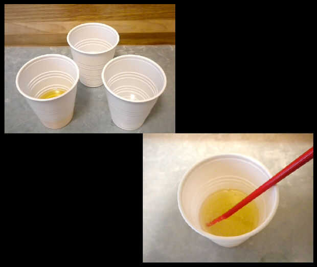 Vierta la resina y el endurecedor en tazas separadas. Una vez que son iguales, viértalos en la tercera Copa. Generalmente hago esto a la vez para iniciar la mezcla. Entonces Raspe los lados y la parte inferior de cada copa para asegurarse de que todo lo he conseguido. En este punto suelen desechar los vasos usados para evitar el derrame.