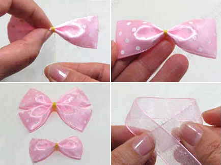 Atar la mitad de la cinta para hacer un arco. Hacer el otro arco que es lo mismo con este uno y otro uno más pequeño por la cinta de 10cm. Luego tomar la cinta de organza. Mantenga el lado izquierdo; doblar el lado derecho hacia atrás para hacer un círculo.