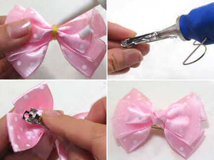 Envolver la tira de cinta con nudo alrededor de la proa; encolarla. Pegar la pinza en la parte posterior del arco por la pistola de cola caliente. Tienes que pegarlas rápidamente para evitar el secado del pegamento.