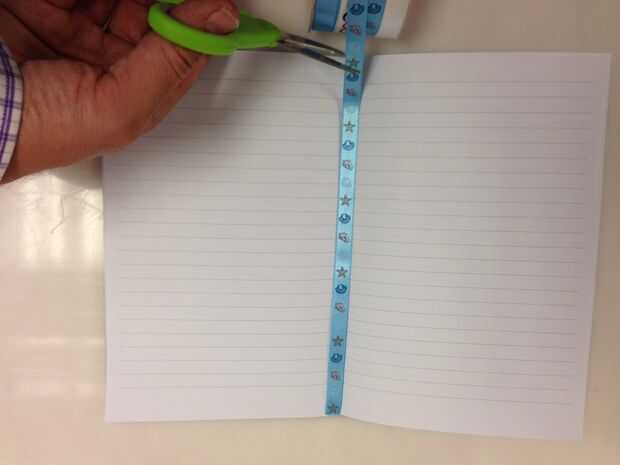 Cortar un trozo de cinta de unos 8.5" largo (la longitud del lado corto de la cubierta). Lugar una pulgada de la cinta contra el pliegue en la parte superior de la cubierta con el papel normal. Si la cinta tiene un lado decorativo, asegúrese de que es cara abajo. Cinta adhesiva hacia abajo con un pequeño trozo de cinta scotch para mantener en su lugar antes de coserlo en la revista.