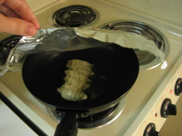 Mientras los fondos de la gyoza están dorando necesitamos al vapor de las tapas. Tome una pequeña cantidad de agua (un par de cucharadas debe hacer el truco) y añadir a la sartén caliente. Colocar una tapa o un pedazo de papel de aluminio encima para atrapar el vapor dentro. Puede que necesite hacer esto varias veces antes de que estén cocinadas.