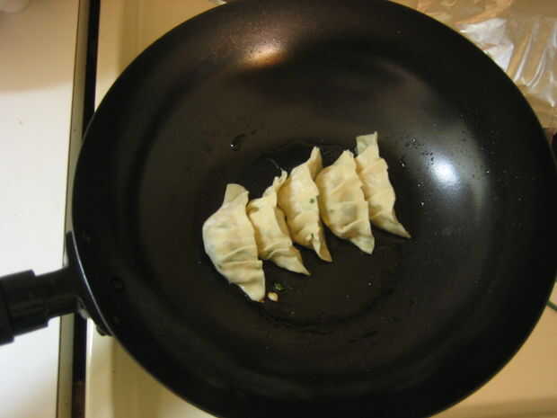 Utilice una luz, aceite sin sabor y fuego medio. Después de la sartén caliente Coloque el gyoza dentro en una línea anidada. Tenga mucho cuidado que el gyoza no se pega a la olla durante la cocción. Esto potencialmente podría rasgarse el gyoza y luego tienes un lío grande en tu pan! Agregue más aceite Si necesita y sacuda la cacerola mucho. Usted puede encontrar cocina con palillos agregará su destreza cuando se pega algo pequeño como una esquina.