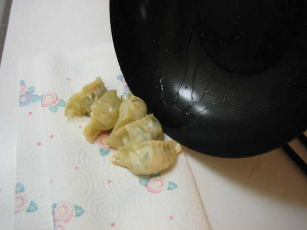 Escurrir sobre toallas de papel. Ya que estamos poniendo en una caja de bento, queremos darles drenaje extra tiempo. De lo contrario, usted podría servirles enseguida. En una caja de bento probablemente desea incluir una botella que sirve de salsa gyoza - salsa de soja con un chorrito de vinagre. También le coloque sobre una superficie que absorba el aceite como un tapetito de papel o una toalla de papel.