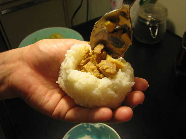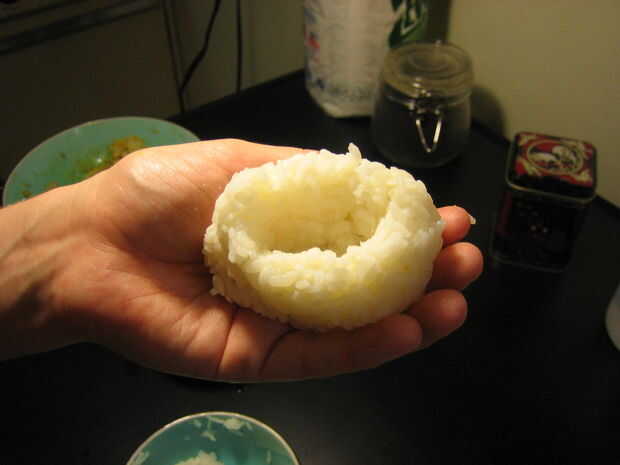Después de que se han decidido por su relleno tomar algunos arroz y forma una bola. Puede hacerlo como grande o tan pequeño como quieras. Usando los dedos o con un utensilio hacer un bolsillo. Agregar el relleno y tapa con un poco de arroz. El triángulo es probablemente la forma más común de onigiri. A forma con las manos. Es tan fácil!