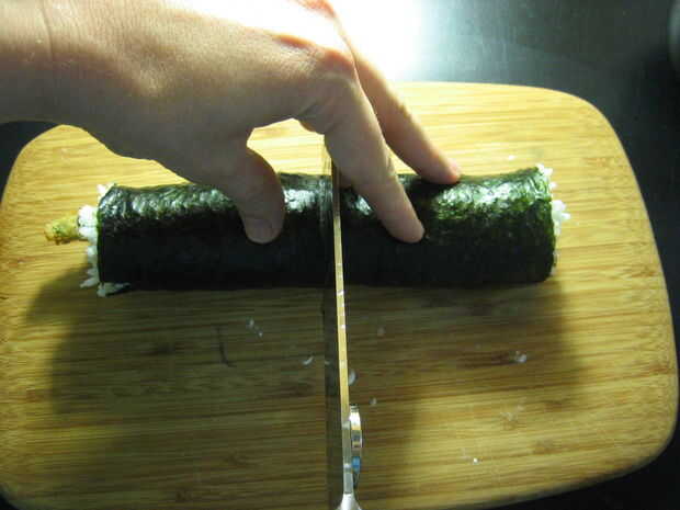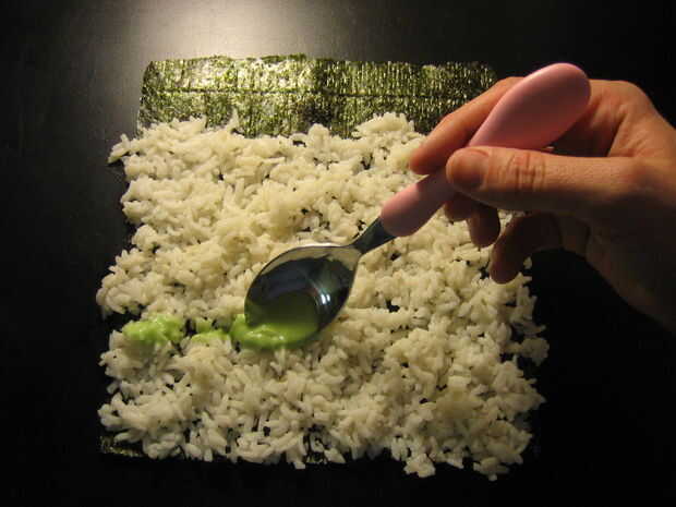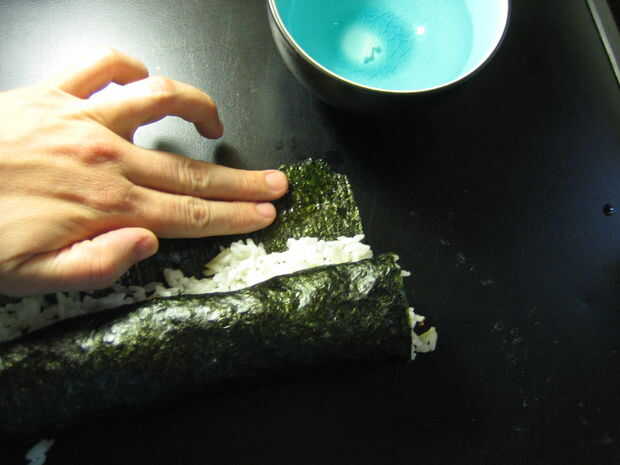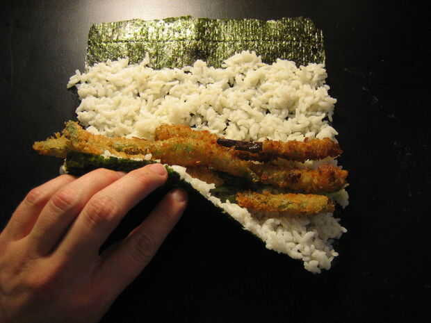 Ahora tienes tu arroz, nori, wasabi y tus frijoles fritos. Es el momento de rodar!