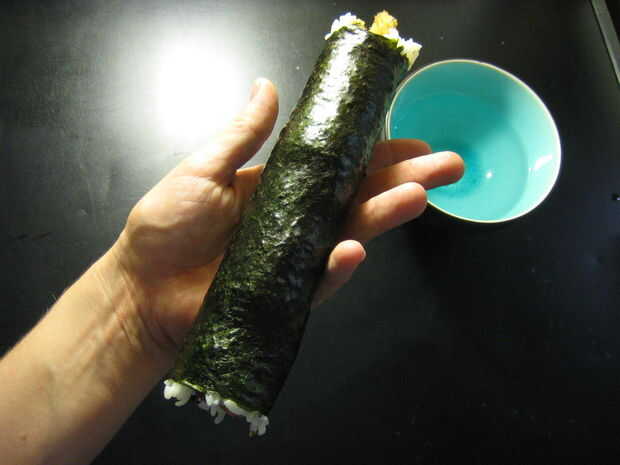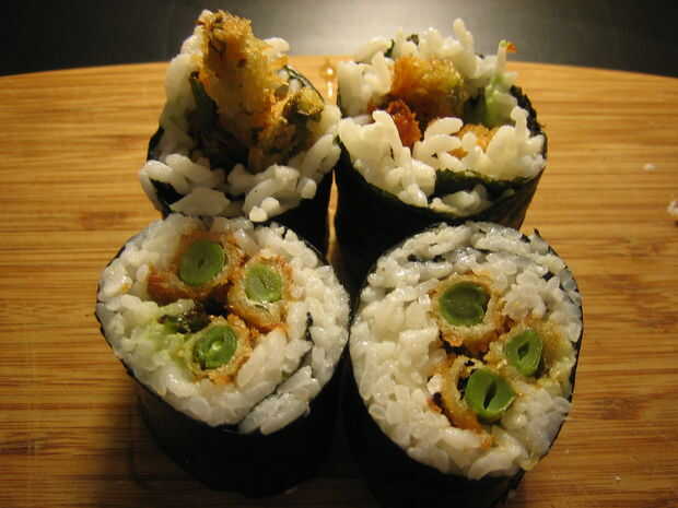Sushi sin duda podría ser un Instructable. Pero en vez de intentar cubrir todo tipo de sushi que se puede encontrar en un bento realmente fantástica caja que sólo voy a cubierta uno solo para que usted consiga comenzado. Maki sushi es el redondo, envuelto en nori (alga marina), rollo de sushi con cualquier número de rellenos sabrosos. Vamos a usar los granos de tempura del último paso para llenar éste.