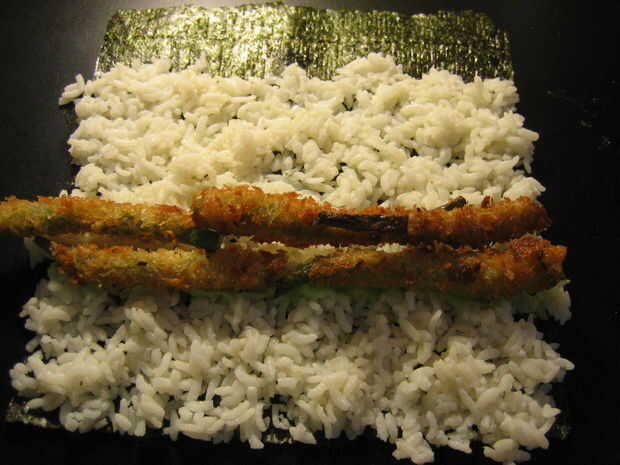 Preparar el arroz de Sushi y dejar enfriar. Arroz de Calrose con un chorrito de vinagre de arroz y un chorrito de mirin es lo que me gusta usar. El tipo de arroz que utilizas es importante - utilizar sushi calrose y arroz pegajoso.