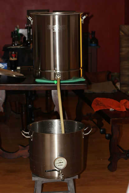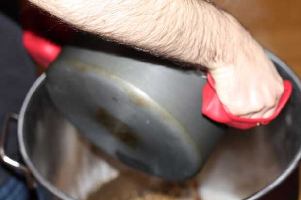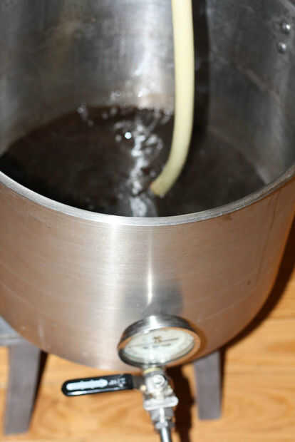 Una vez que ha dejado unos 15 minutos en el puré, calentar un galón de agua por el agua de aspersión. Hay varias formas de sparge, con sus propios matices dependiendo de las configuraciones y si decides en puré o no (elevar la temperatura de su puré a 170° F para inactivar enzimas y ayudar en la recuperación de azúcar). Aquí hice una hornada simple aspersión después de drenar el mosto desde el puré sin necesidad de hacer un puré de salida. El agua de aspersión debe ser de alrededor de 170° F para evitar la extracción de taninos ásperos de su puré.