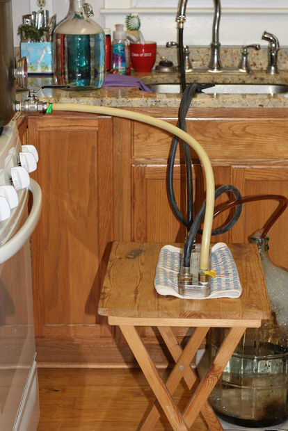 En este paso nos llega a ver si tenemos un futuro de plomería por si o no el agua de enfriamiento se obtiene de grifo para drenar y el mosto se obtiene de hervidor a Damajuana sin derramar. No tengo un futuro en las tuberías por lo que inevitablemente estoy absorbiendo uno u otro, pero la idea es enfriar su hierba hirvienda de caliente a una temperatura de la levadura puede manejar.
