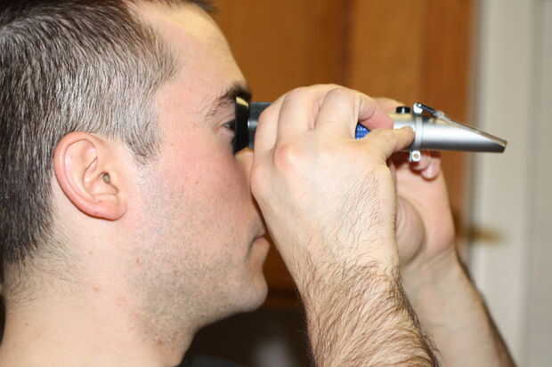 Una vez que se vacía la caldera y el agua se apaga es hora de tomar la gravedad de su hierba. Gravedad que mide la cantidad de sólidos disueltos en el mosto en lo referente a agua pura y le da usted una idea de cuánto azúcar le tiene a fermentar. Nos estamos enfocando una gravedad de 1.040, este es su gravedad original de destino (O.G.). Cuando usted toma esta primera lectura que se va obteniendo una gravedad específica (S.G.) en su volumen inicial (V1), puede ajustar hacia abajo mediante la adición de más agua después de la fórmula de concentración ubicua/volumen hasta el volumen final (V2):