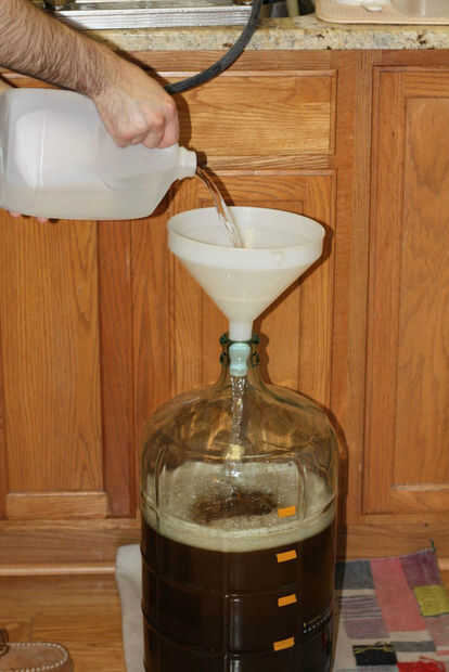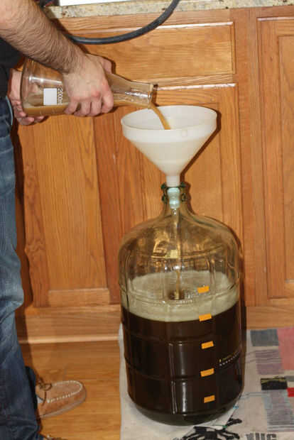 Es el último paso de la noche, añadir la levadura. Esta receta es pequeña bastante usted puede usar una tortazo paquete o frasco para lanzar suficiente levadura para una fermentación saludable. Usé levadura refrigerada aclarada de una preparación previa por lo que opté por un arranque de 800 ml para que las cosas van. Derramé la levadura en la Damajuana con el embudo seguido por una porción de eso 0,80 galones de agua que necesitaba el paso anterior para ayudar a lavar las cosas abajo.