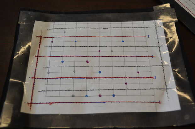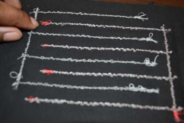 Su hilo conductor actuará como su bobina. Utilizando la plantilla que creó, coser sobre las líneas conductoras. Para ayudarle a distinguir los caminos positivos de los caminos negativos, usar dos colores diferentes de hilo. Tiendo a usar hilo negro para los negativos caminos e hilo rojo para el positivo. Usted quiere asegurarse repasar cada paso dos veces, extendiendo los caminos un poco más. Esto es especialmente importante cuando sus rutas "vuelta" y asegura el flujo actual sin problemas.