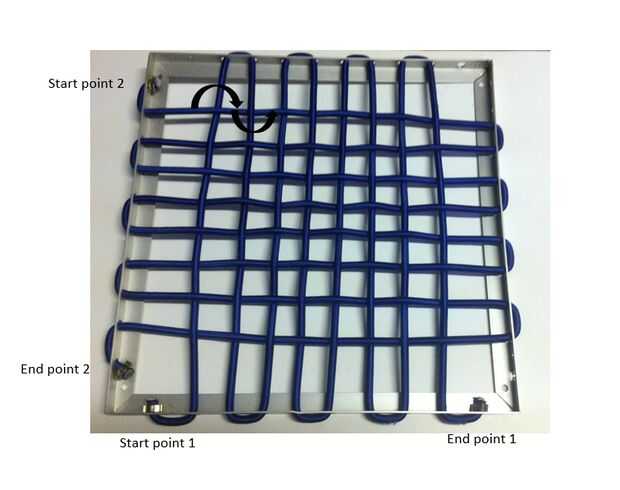 Se empieza en uno de los lados donde tiene 10 agujeros. Puede comenzar desde el interior del perfil y hace un nudo temporal. Sabes que ir al siguiente hoyo y rasgar el extractor a través del orificio en el lado opuesto. Para el primer carro de arrastre es muy simple. Alcanzado el último agujero otra vez, haces un nudo temporal. Terminas en el mismo lado donde empezaste (en el décimo agujero).