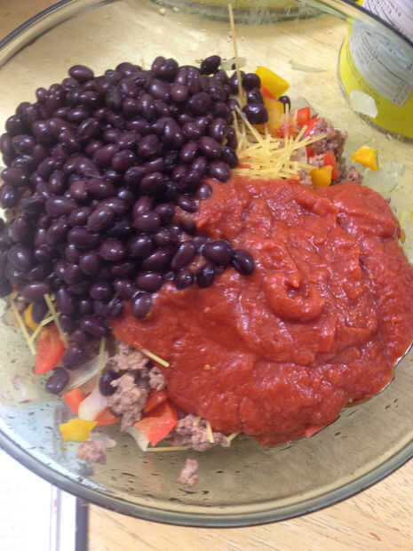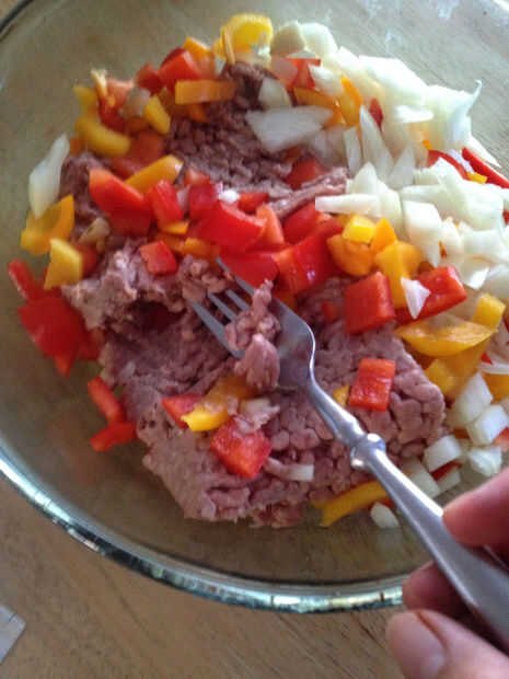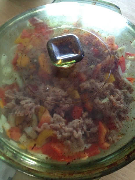 En un tazón de fuente de prueba 3 cuartos microondas/cacerola, colocar la carne, romper con un tenedor, luego añadir cebolla, pimentón y ajo. Cubrir y microondas en high por 9 minutos, revolviendo una vez.