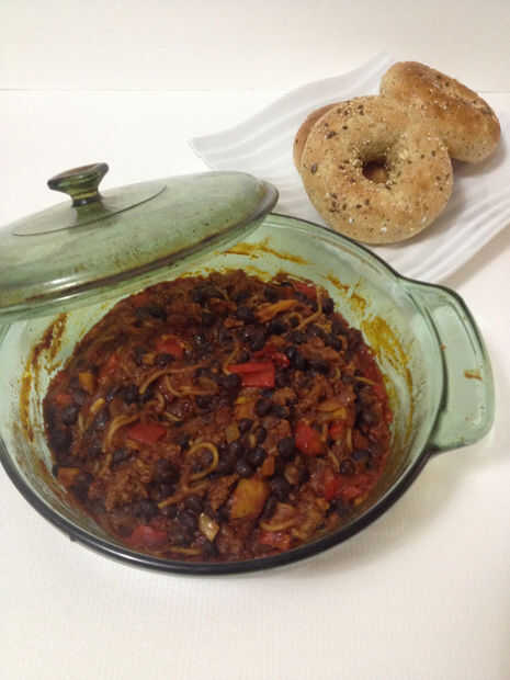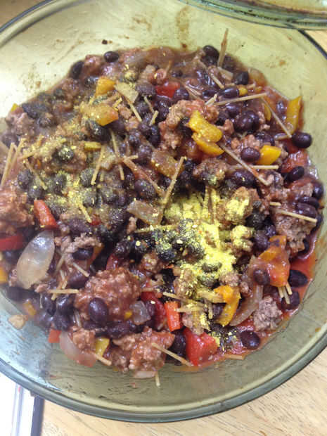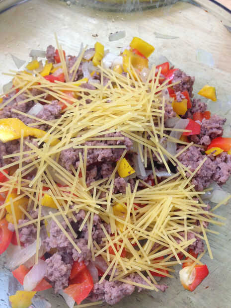 Añada los ingredientes restantes, mezclar suavemente, poner la tapa nuevamente y microondas para 30-35 minutos (hasta que esté cocido espaguetis) - cada 10 minutos, sacan la cazuela del microondas y revuelva la mezcla.