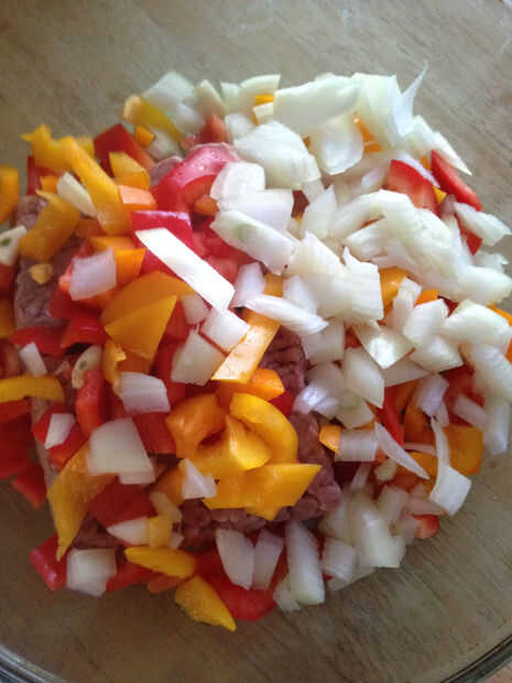1 cada uno amarillo y rojo pimentón (o si no son que barato, 1 pimiento verde basta, uno grande por lo que será aproximadamente 1/2 c en cubos/dados)