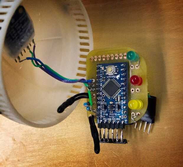 (Arriba) Arduino Mini en un circuito para activar o desactivar componentes de alta potencia empate basado en tres entradas posibles: una petición HTTP desde el WiFi del protector (en la parte posterior donde se puede ver), una señal de temperatura, o una inclinación del acelerómetro.