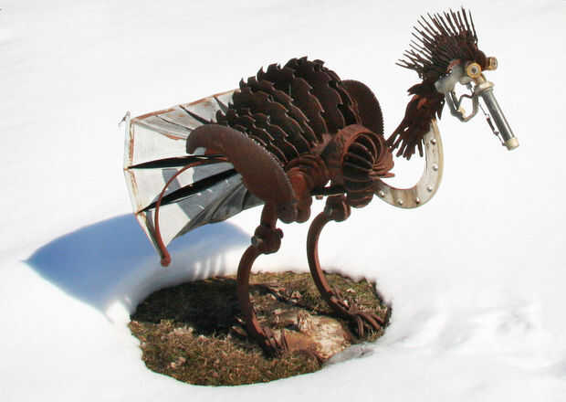 (Arriba) Aves de metal de desecho de la Forevertron