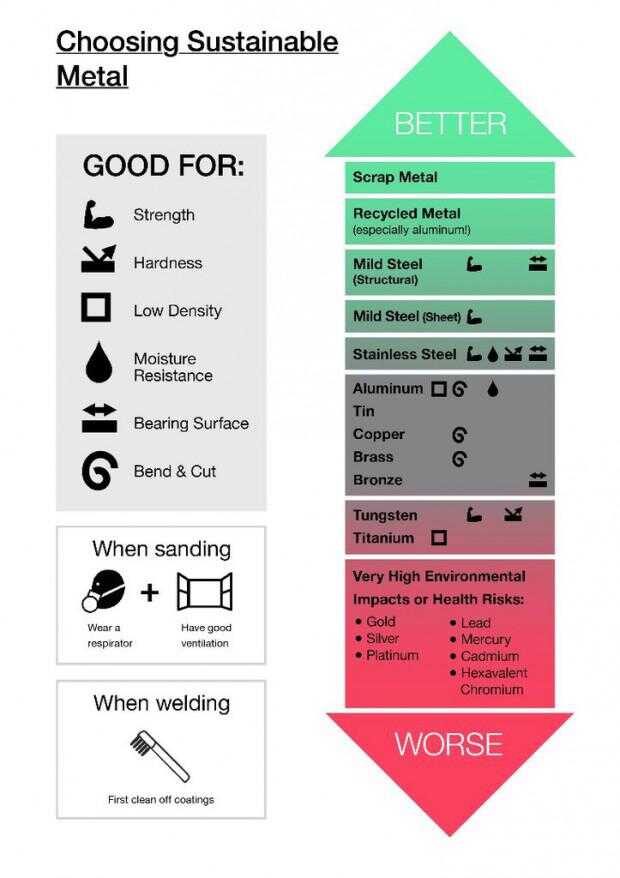 En gran medida la mayoría del metal con que es probable que construir es de acero y aluminio. La buena noticia es que la mayor parte del tiempo, metales baratos son verdes metales y metales caros no son. Hierro y acero son no sólo los metales más baratos que puede conseguir, pero también los menos metales consumen mucha energía y recursos. (Un gran papel del MIT muestra cómo personas sólo necesitan desenterrar 2-5 libras de mineral para cada 1 libra de hierro, con unos 20-30 MJ/kg de energía incorporada.) También es por mucho el más reciclado de metal. Y no es tóxico, por sí mismo.
