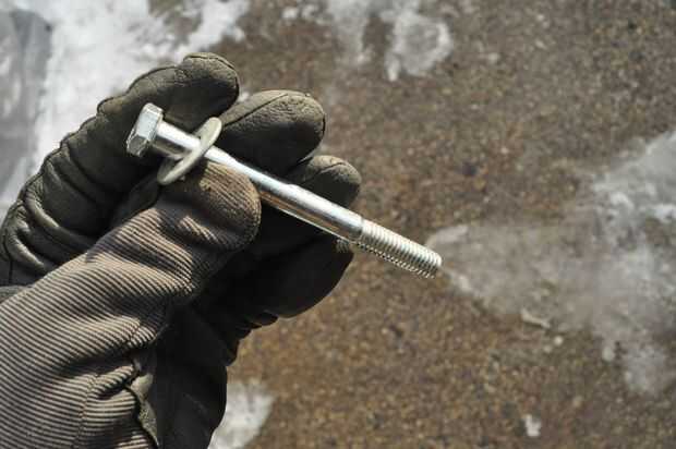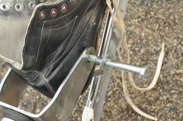 Luego puse una arandela en el perno, empujado en el patín, a través de la lavadora, el tubo, la otra arandela y al otro lado de la raya. Agregué otra arandela y roscado de la tuerca.